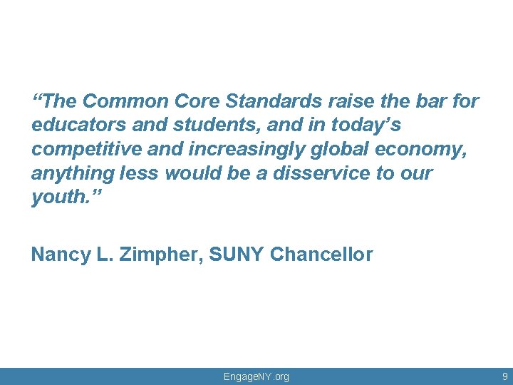 "The Mutual Core Standards raise the bar for educators and students, and in today's competitive and increasingly global economy, anything less would exist a disservice to our youth. " Nancy Fifty. Zimpher, SUNY Chancellor Appoint. NY. org 9